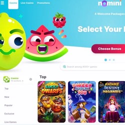 Nomini offers thousands of games from top providers: slots, live casino, table games, and more. The site is well-organized and easy to navigate, with separate sections for bonuses and popular games.